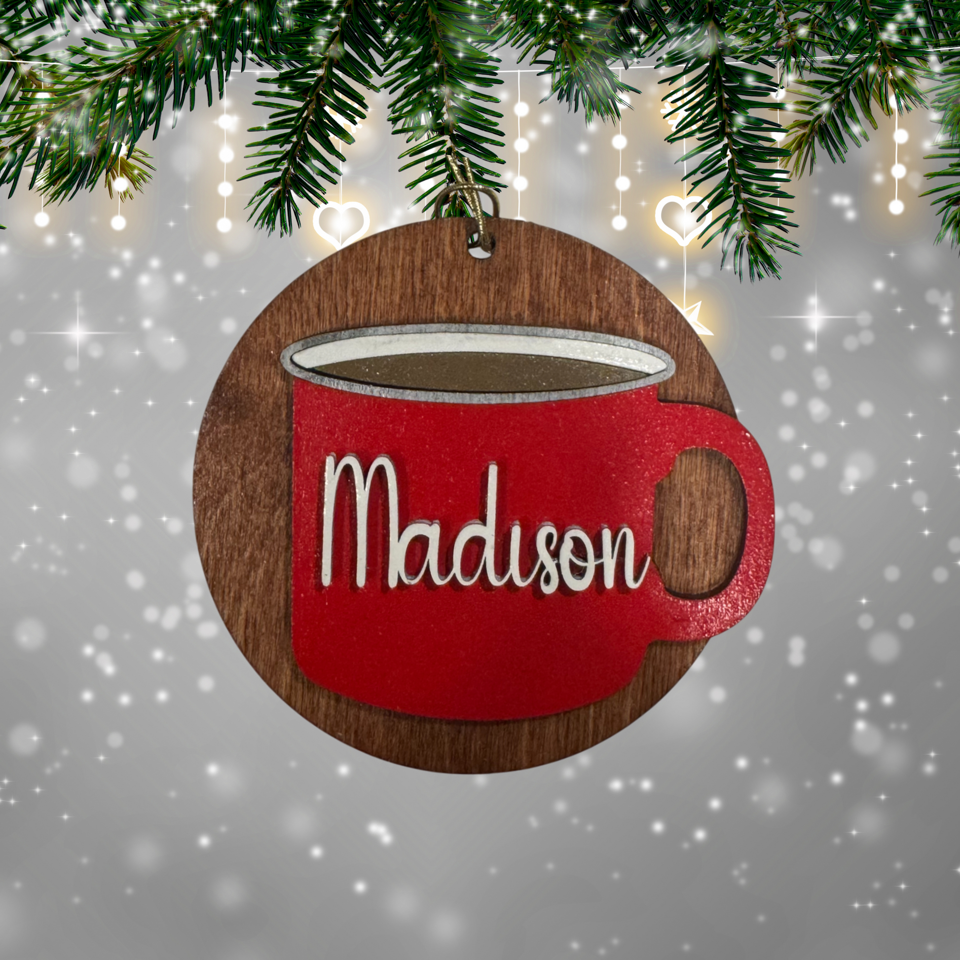 Personalized Wooden Ornament: Christmas Mug, Laser Cut, Custom Name, Year
