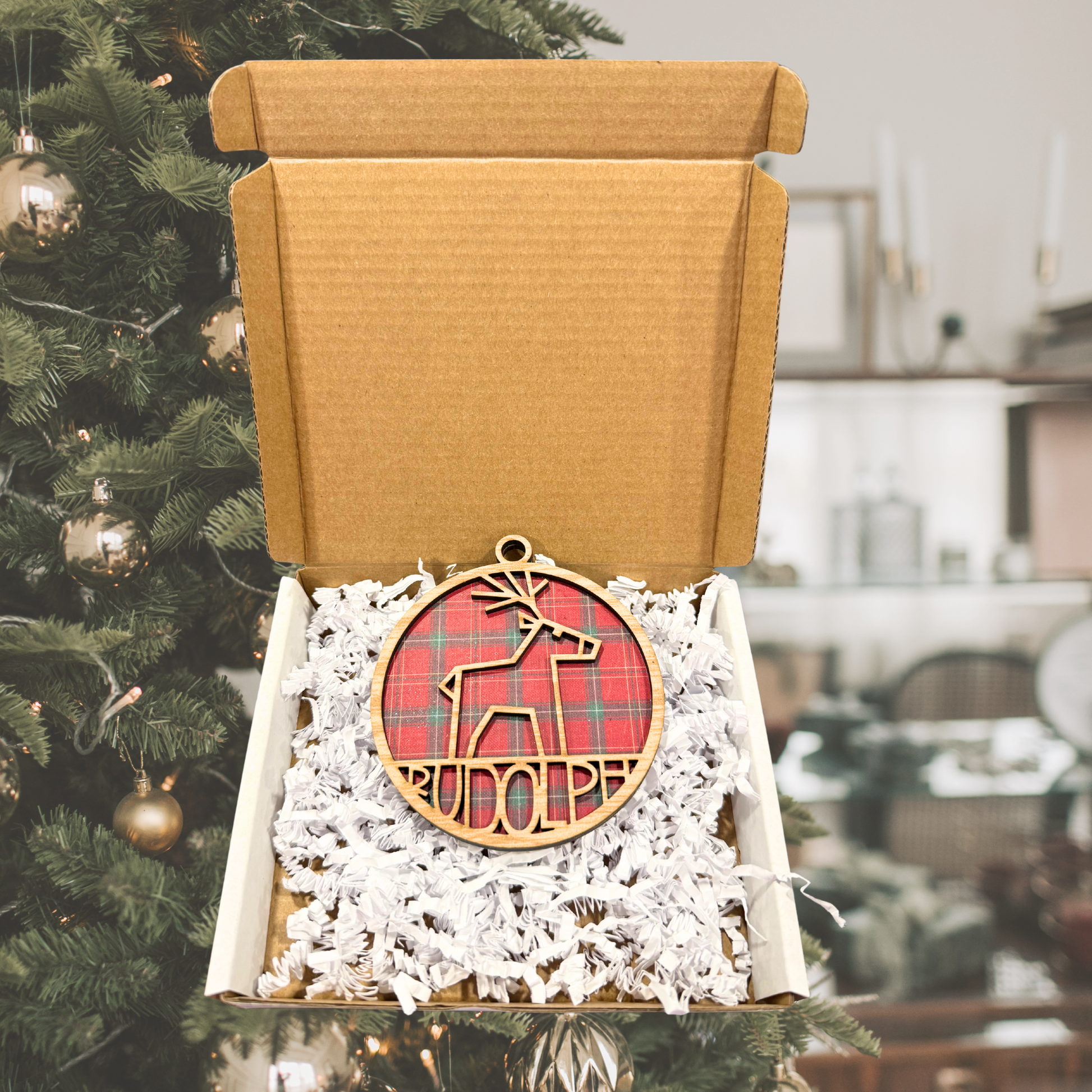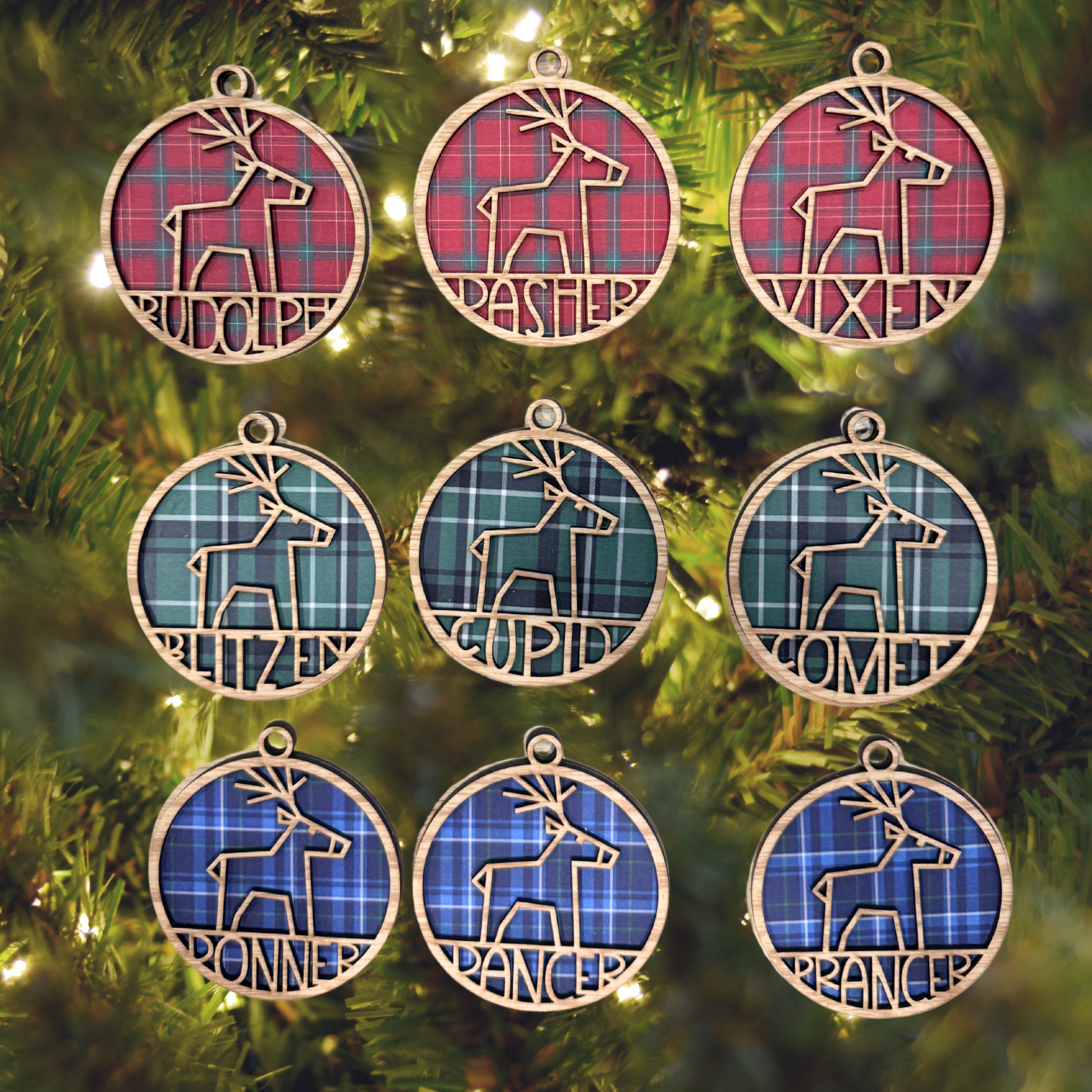 Personalized Tartain Plaid Wooden Ornament: Reindeer Rudolph , Custom Name, 2025 Ornament