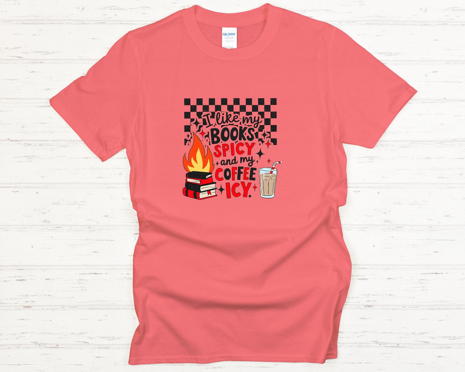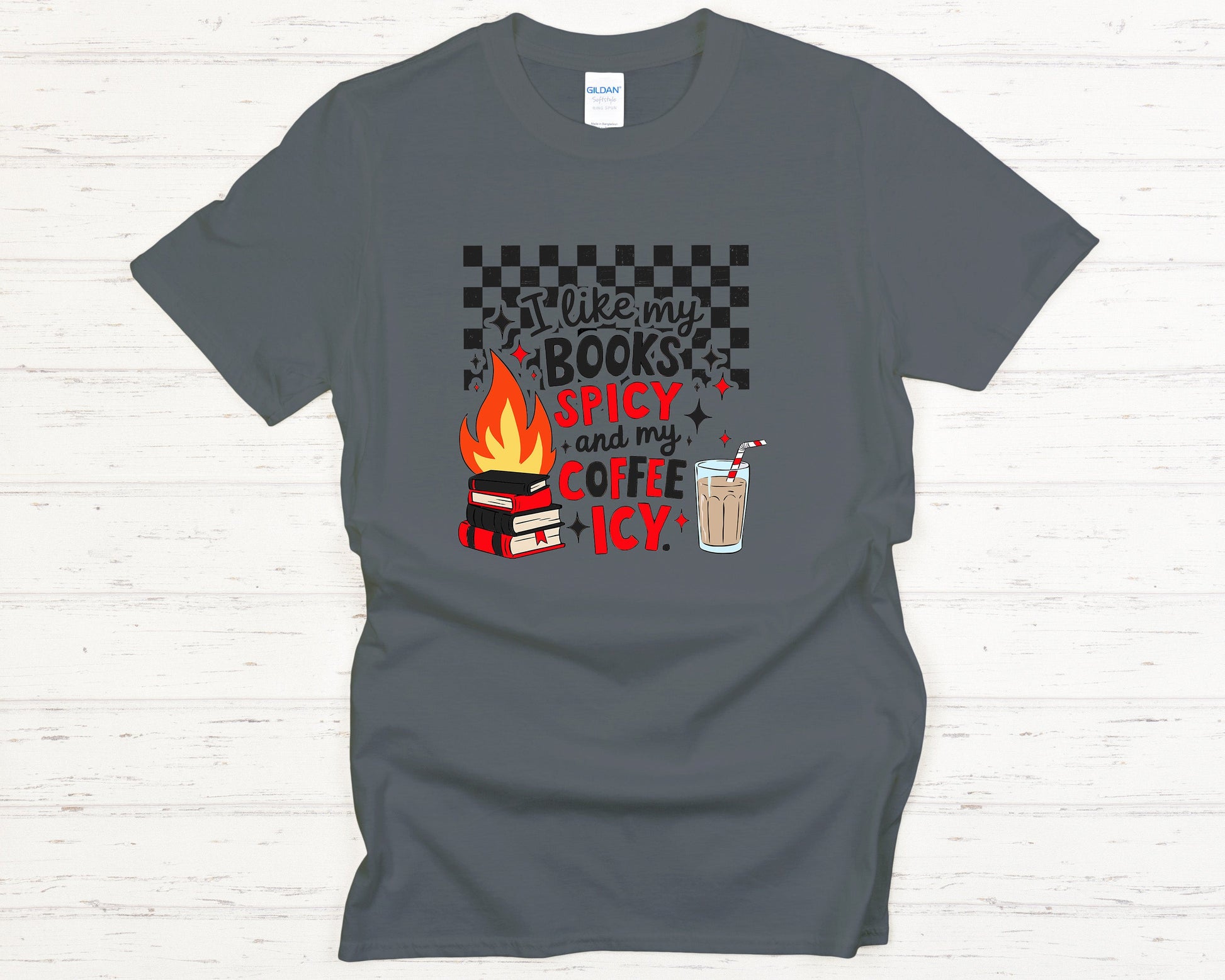 Funny Book Lover T-Shirt Cozy Reading Tee with Spicy Books & Icy Coffee Graphic, Aesthetic Checkered Design Shirt