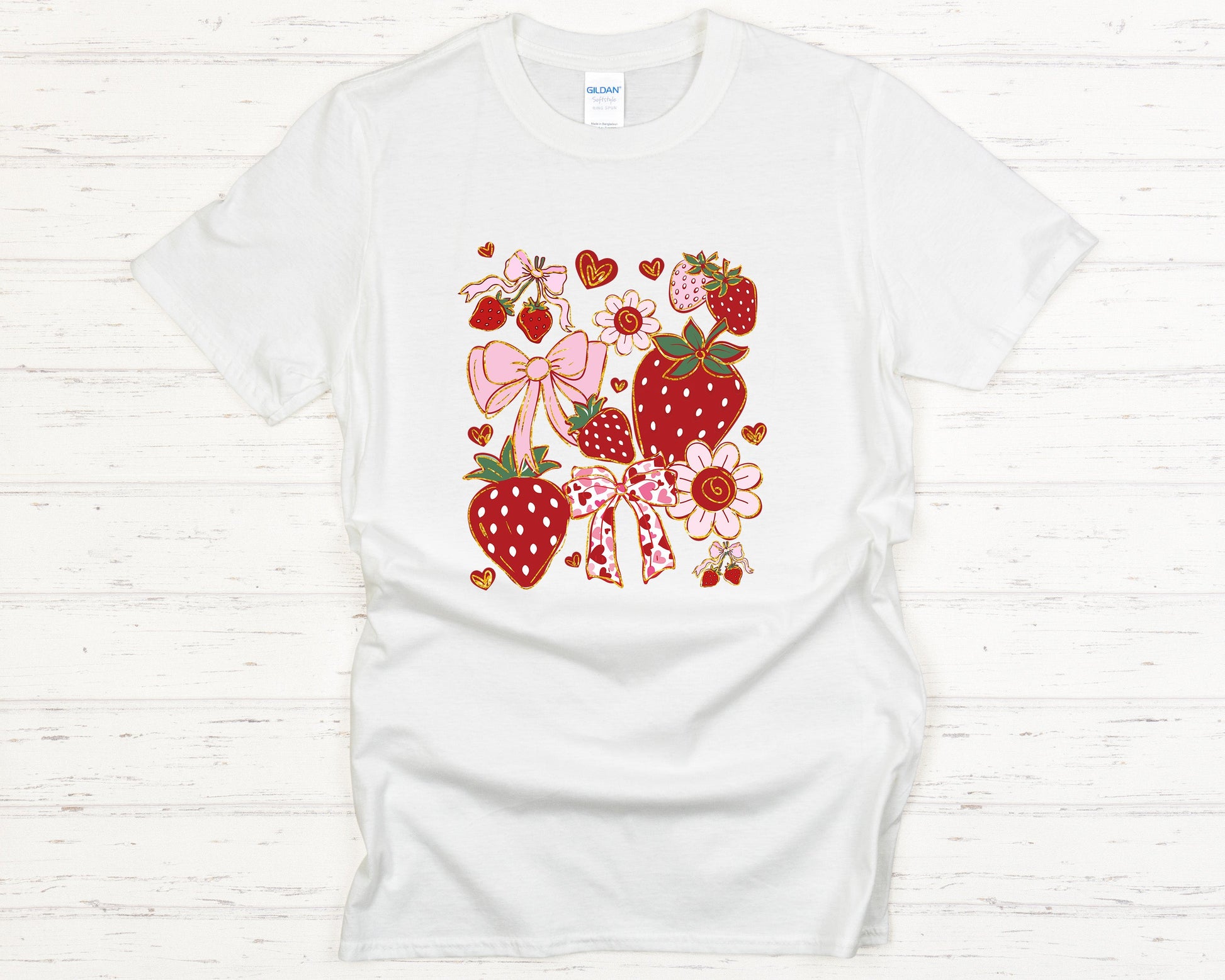 Summer Vibes Strawberry Bow T-Shirt Cute Berry Graphic Tee Farmhouse Style Sweet Summer Outfit